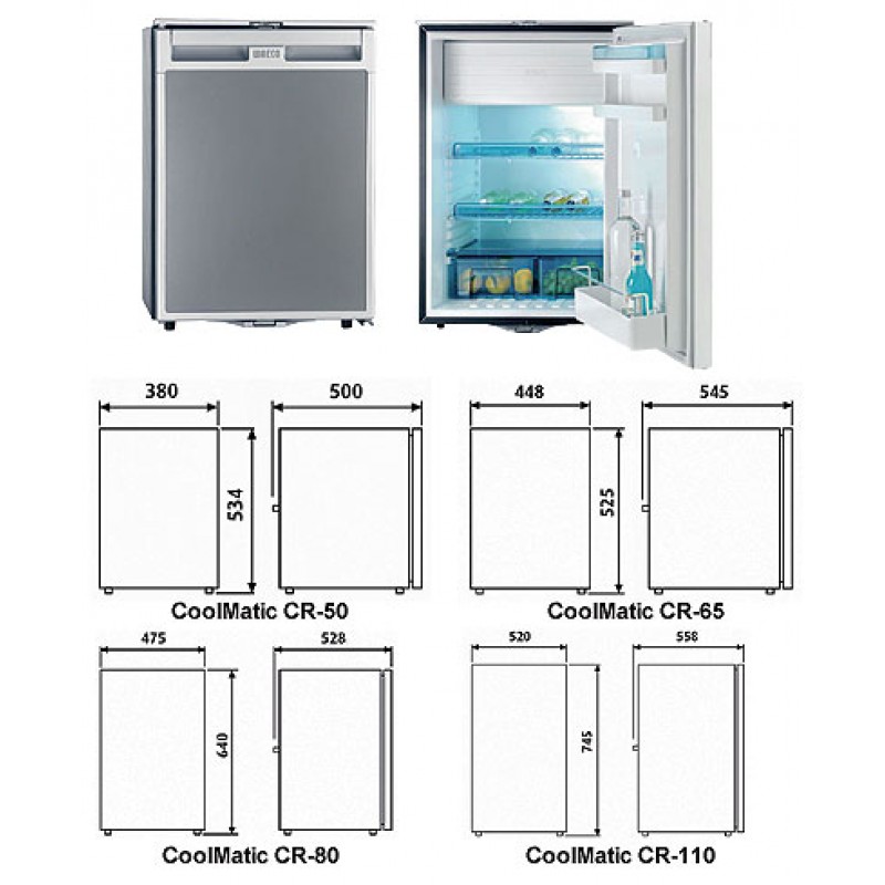 Компрессорные холодильники с отдельными морозильными камерами (как в домашних холодильниках). Позволяют поддерживать температуру заморозки до -18 градусов при наружной температуре до + 43 градусов! Универсальное питание 12/24 В постоянного тока с защитой от низкого напряжения и переполюсовки. Дверца, удерживаемая двумя замками, не отрывается самопроизвольно даже на волнении. Одновременно существует возможность зафиксировать дверцу в приоткрытом состоянии для вентиляции в период простоев судна. Возможность регулировки дверцы для открывания как справа налево, так и слева направо. Корпус из эмалированной стали. Дверца и внутренняя камера из пластика. Нержавеющий крепеж. Внутренняя подсветка. Полочки для бутылок на дверце. Опциональные коробы для стандартной установки (дверца выступает за установочную плоскость) или установки заподлицо (дверца на одном уровне с установочной плоскостью), позволяют надежно закрепить холодильники на судне.МодельCR-50CR-65CR-80CR-110Объем общий/морозильной камеры48/5 л64/7,2 л80/7,9 л108/10,2 лМощность компрессора40 Вт45 Вт48 Вт50 ВтПотребление тока*1,4 А*ч при 25°C, 1,7 А*ч при 32°C1,6 А*ч при 25°C, 1,9 А*ч при 32°C1,8 А*ч при 25°C, 2,1 А*ч при 32°C2,2 А*ч при 25°C, 2,5 А*ч при 32°CВес19 кг20 кг23 кг28 кг * Потребление тока для поддержания внутренней температуры + 5 градусов (-18 градусов в морозильной камере) при различной наружной температуре. Напряжение питания: 12/24 В. Цвет: серебристый. Производитель: «Waeco», Германия.