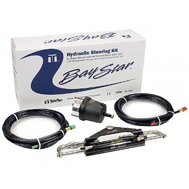 Гидравлическая система рулевого управления в комплекте. Предназначена для применения с подвесными моторами мощностью до 150 л.с. Снабжена встроенными NFB клапанами, устраняющими передачу реактивных моментов от двигателя на рулевое колесо, что облегчает управление и повышает безопасность, дает возможность убрать руки с рулевого колеса, не опасаясь неконтролируемого поворота лодки. Может поставляться с механизмом изменения угла наклона руля. Не рекомендуется для использования с двигателями: Mercury Optimax 150HP (рекомендованная система - SeaStar, либо BayStar со шлангами от SeaStar); Mercury F150 (новый 4-тактный мотор Mercury, запущенный в производство в 2011 году, его реальная мощность превышает 160 л. с. в связи с чем для данного мотора рекомендуется только гидравлическая рулевая система SeaStar). Включает все, что необходимо для установки, включая гидравлические шланги и гидравлическую жидкость. Отдельно следует прибрести лишь рулевое колесо. Примерное количество оборотов полной перекладки руля: 4,5 Минимальный радиус изгиба шлангов: 10 см. В составе: рулевая машинка (гидронасос) HH4016, гидроцилиндр HC4645H, комплект фитингов, комплект крепежа, гидравлическое масло, комплект шлангов длиной 6,4 м (HT4420H) или 9,6 м (HT4430H). Производитель: «SeaStarSolutions» (ранее «Teleflex»), США.